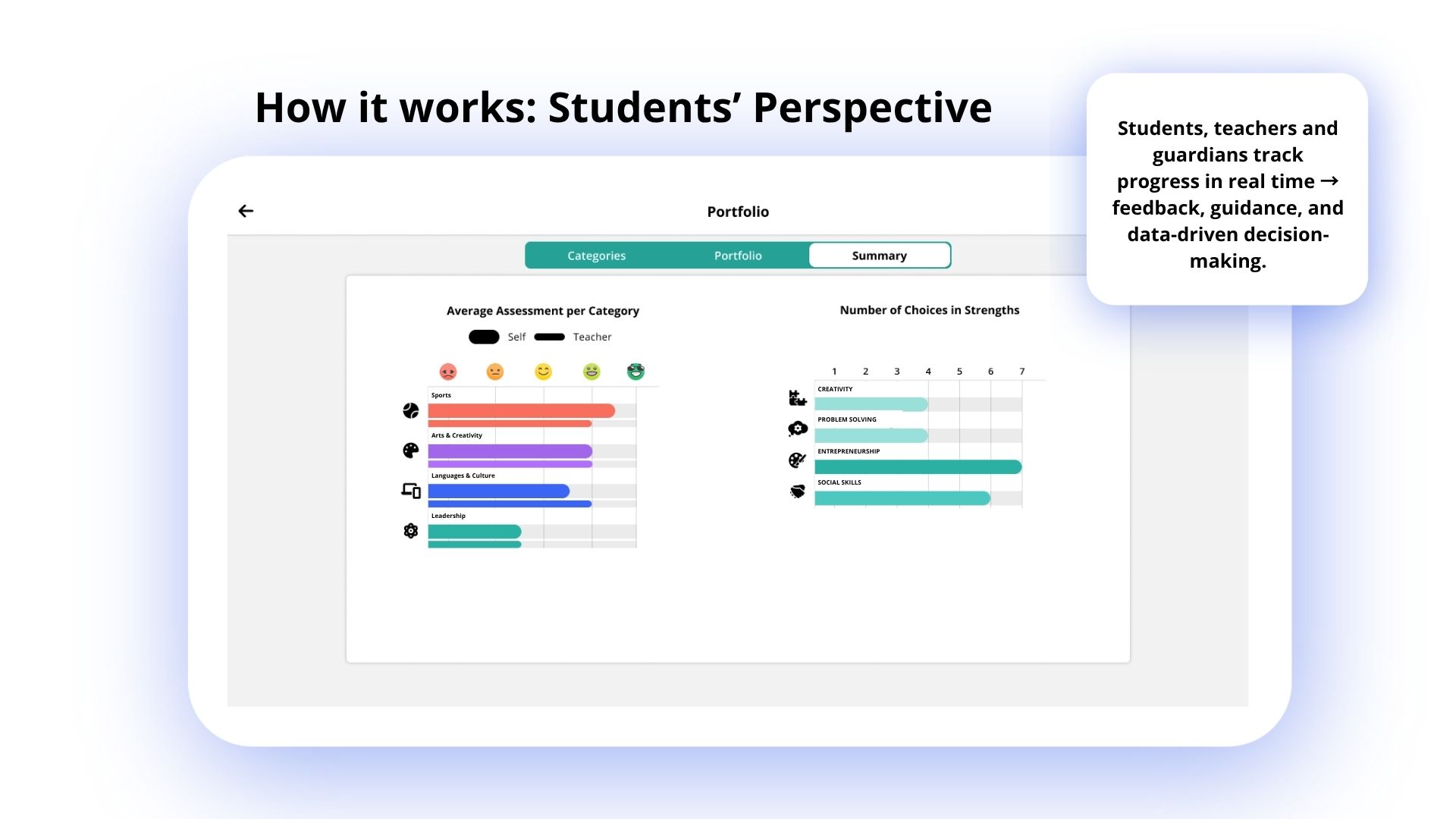 The central tool for the project was the Metacognition Portfolio, designed and built by Qridi. The software enabled: