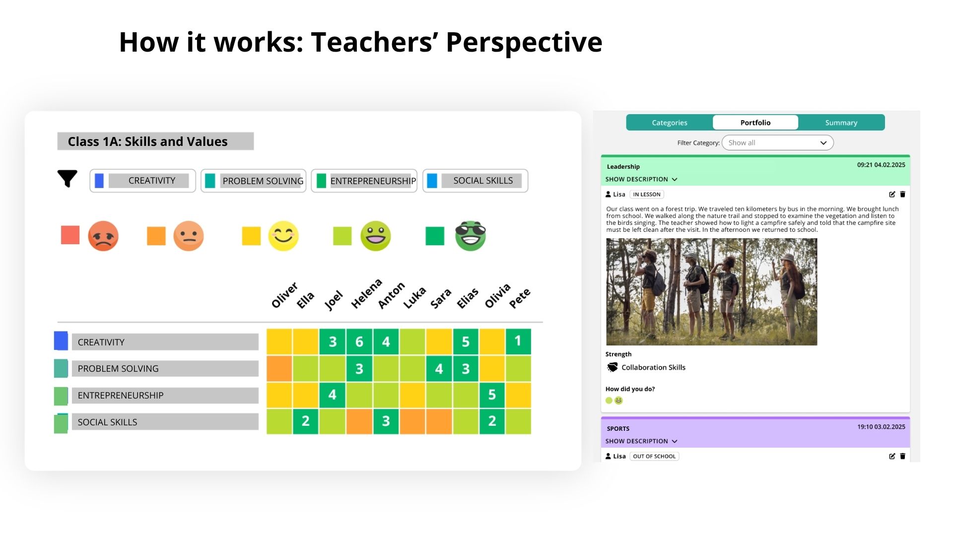 The core design principle behind Qridi is straightforward: make skills visible. Not just academic results, but the transversal competencies, self-assessments, and evidence of learning that traditional grade books cannot capture.